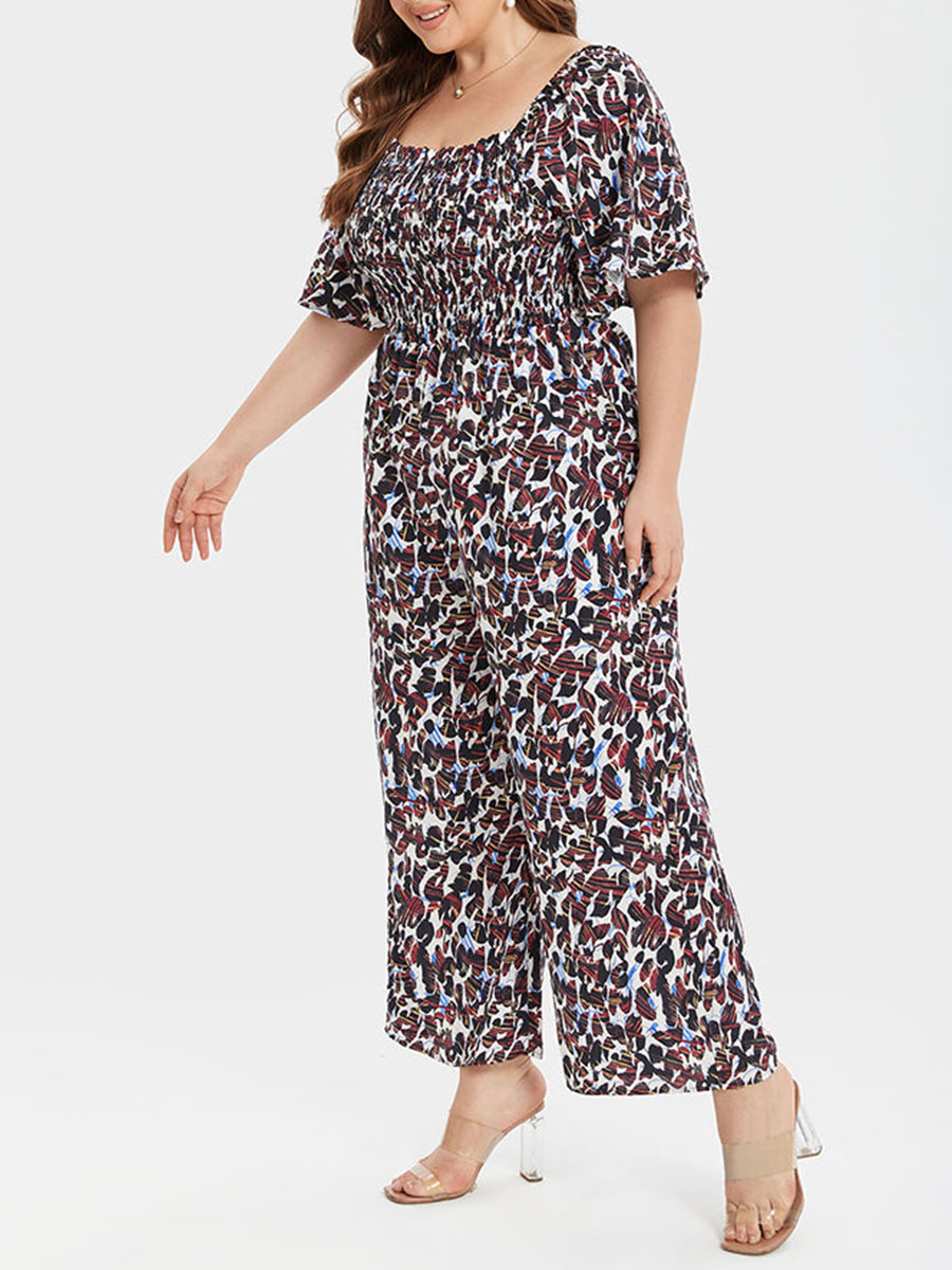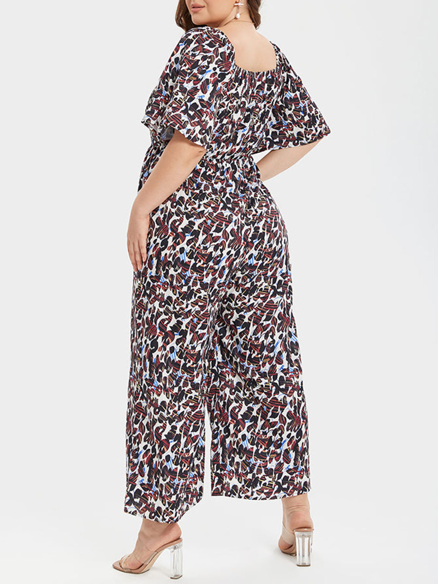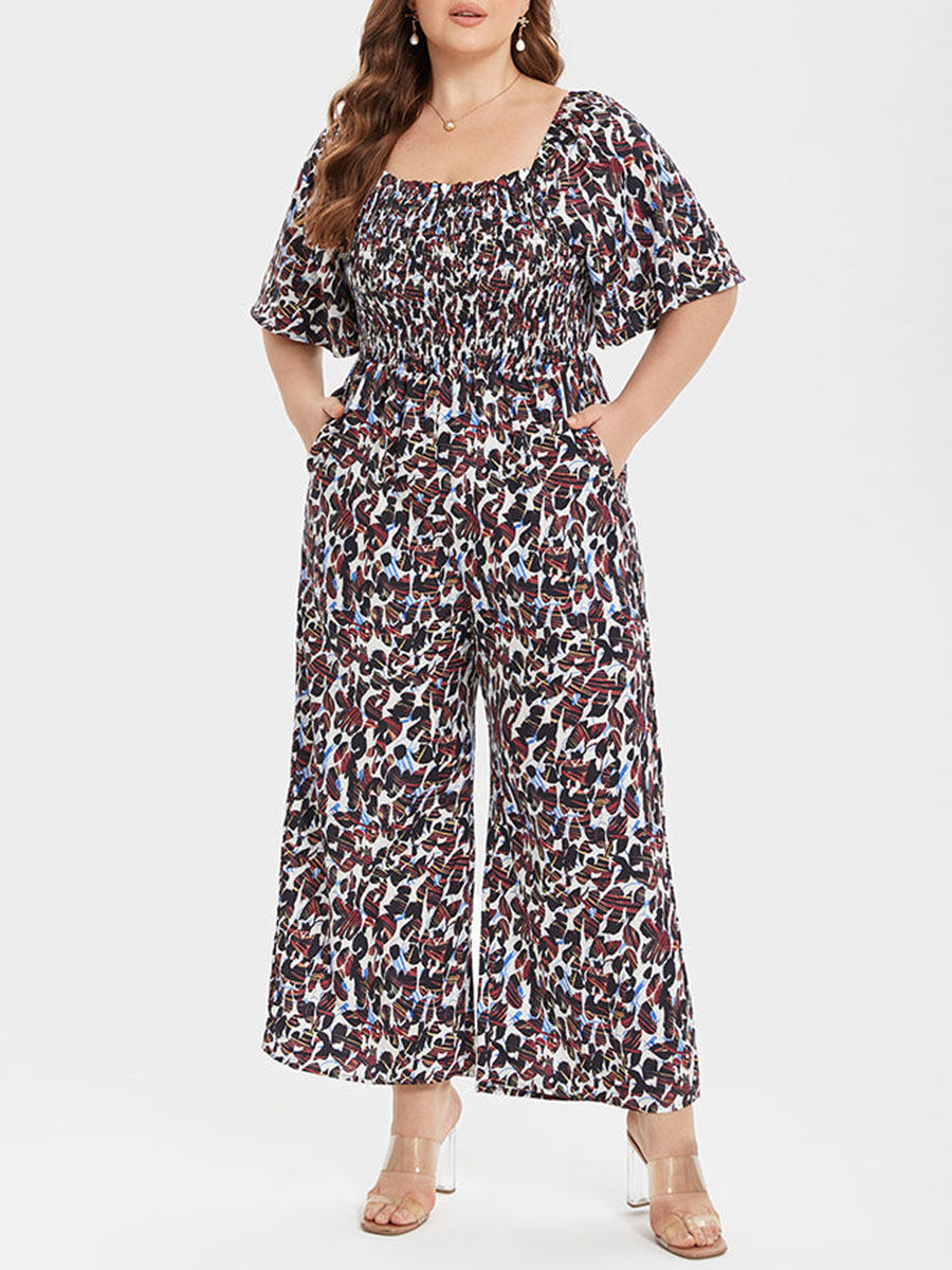 Plus Leopard Square Neck Pocket Elastic Waist Jumpsuits 978538
