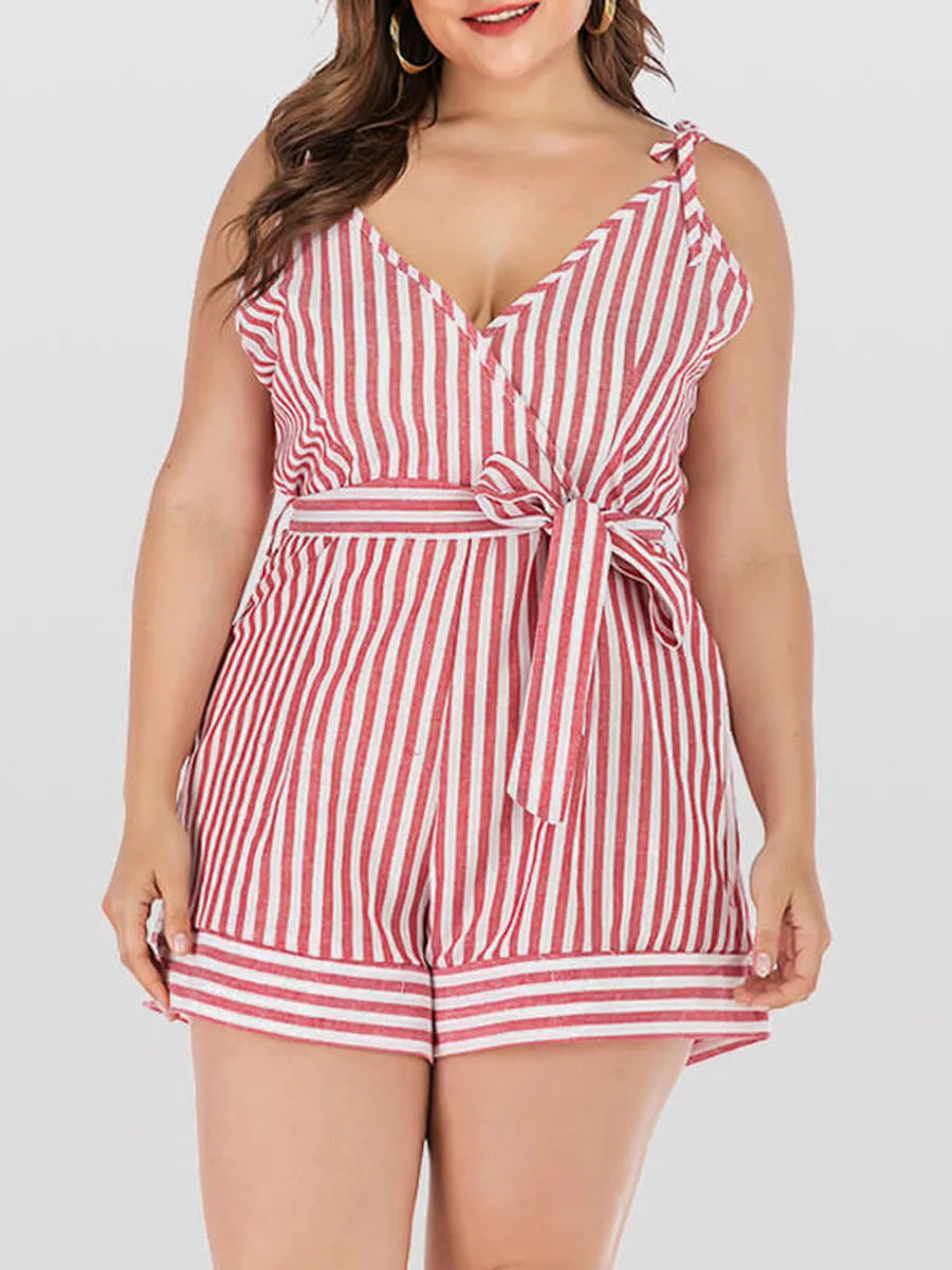 Plus Pink Crisscross Striped V-Neck Knot Side Romper 978528