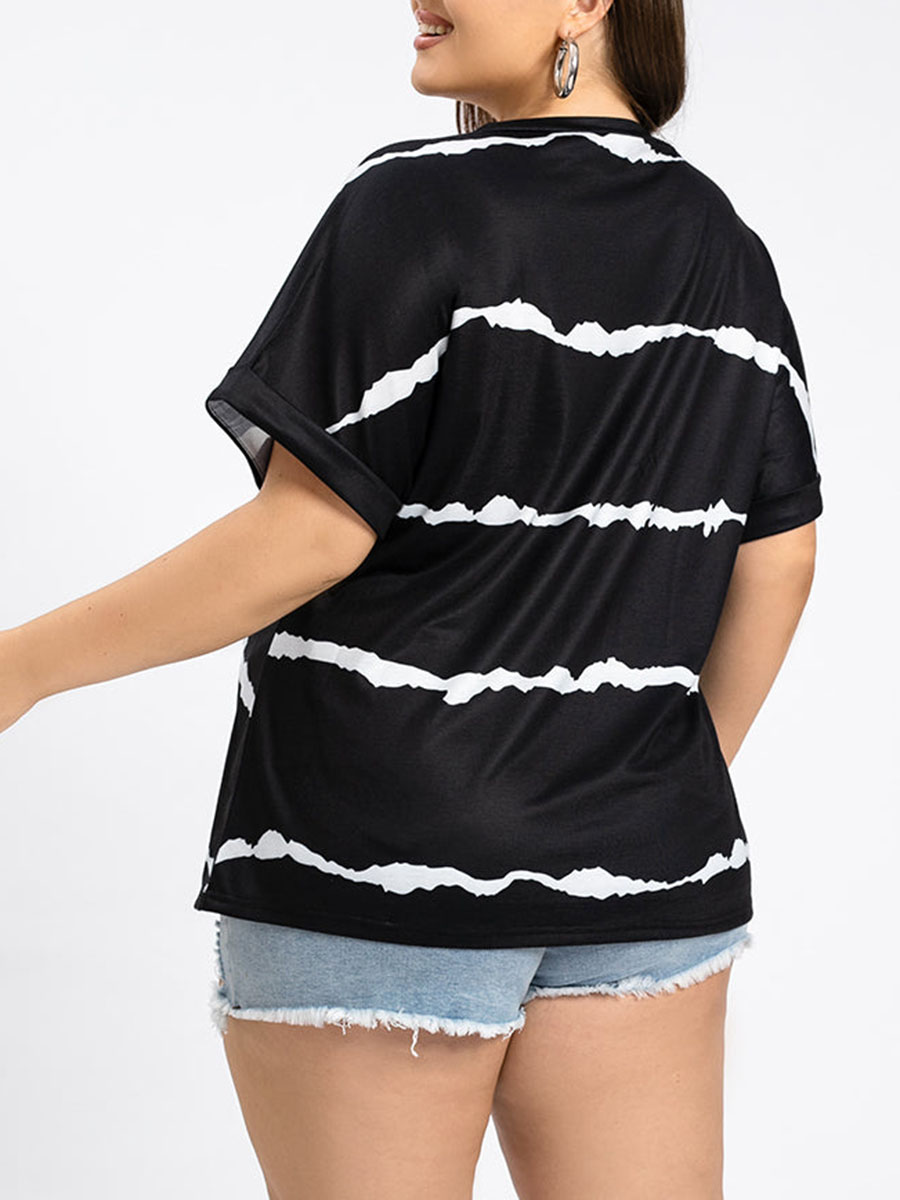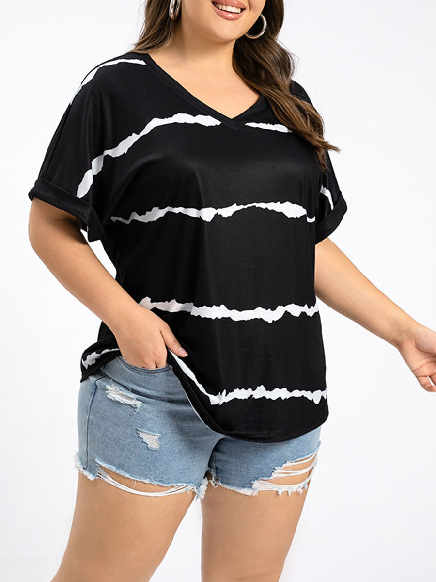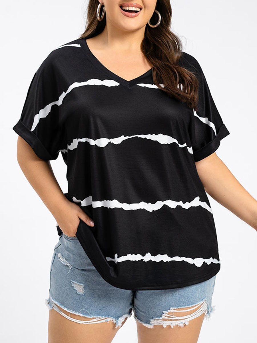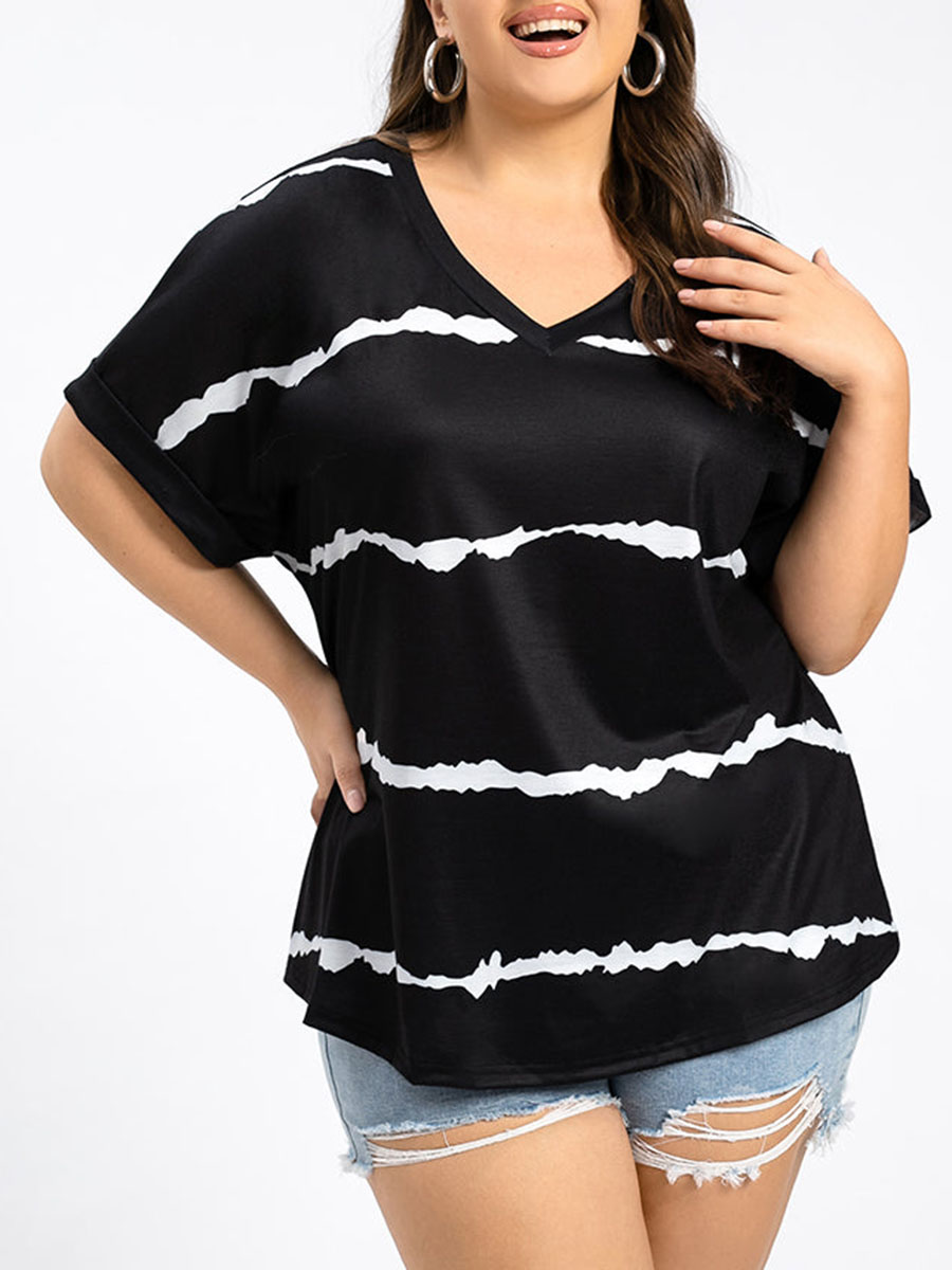Plus Striped V-Neck Cuffed Sleeve Tee 978181