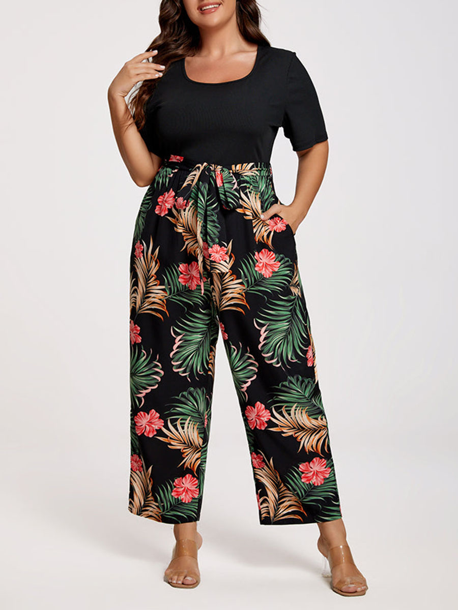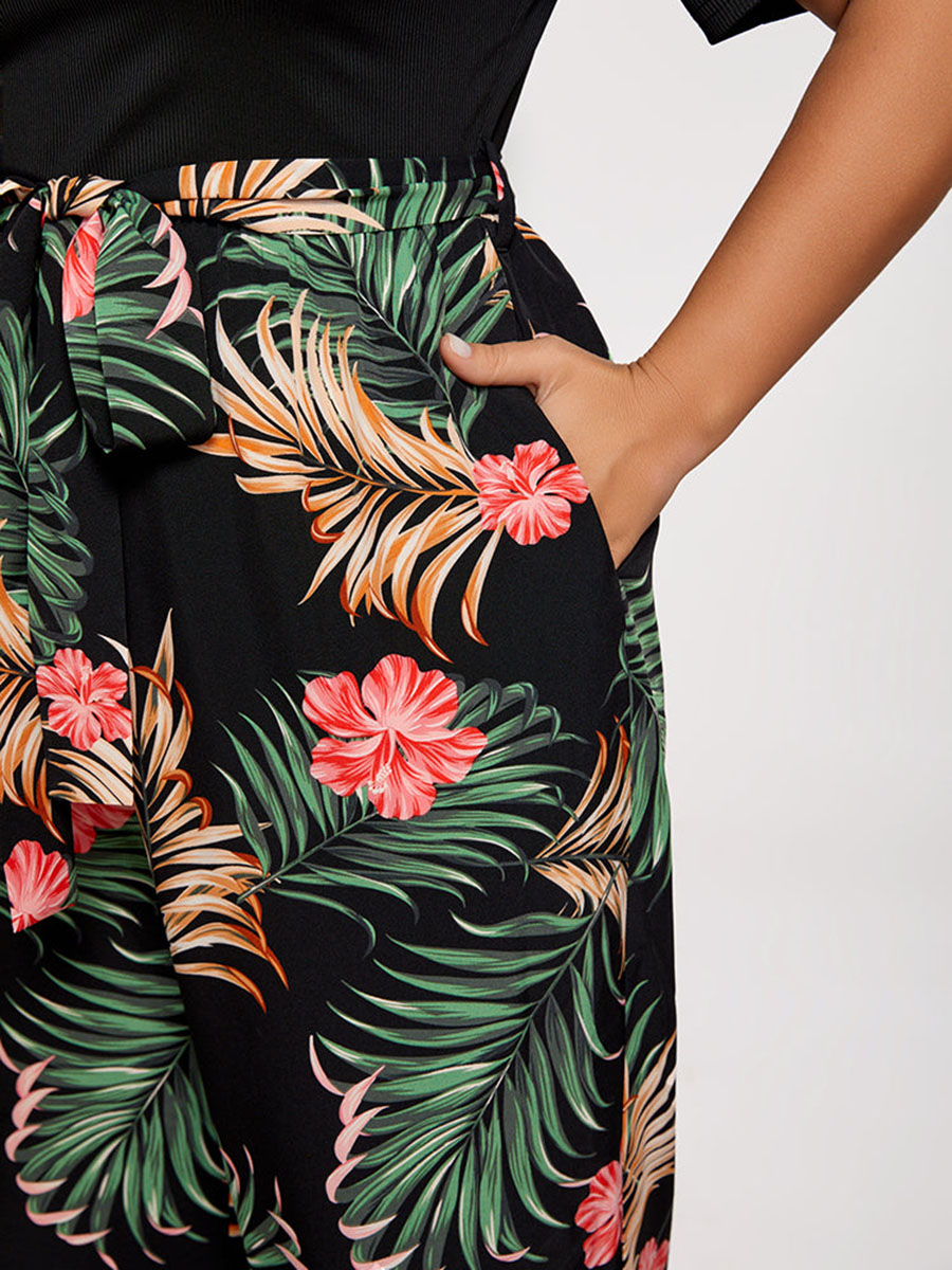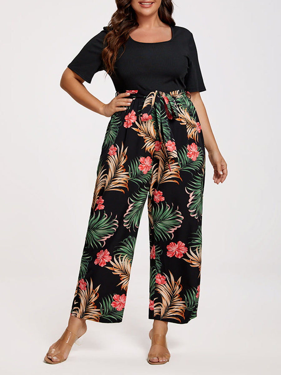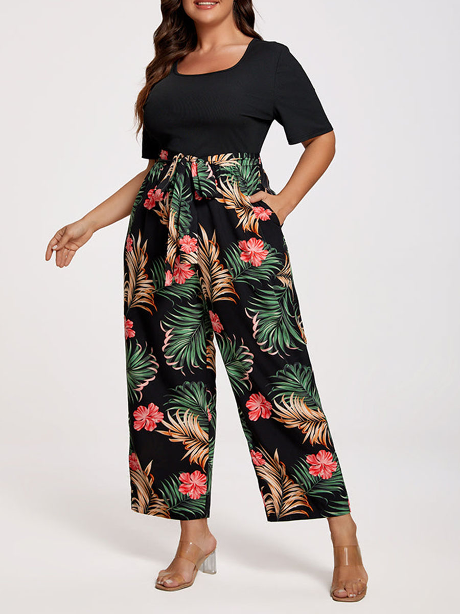 Plus Tropical Print Square Neck Belted Jumpsuit 978593