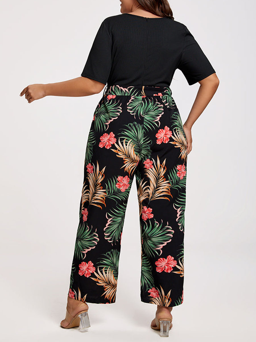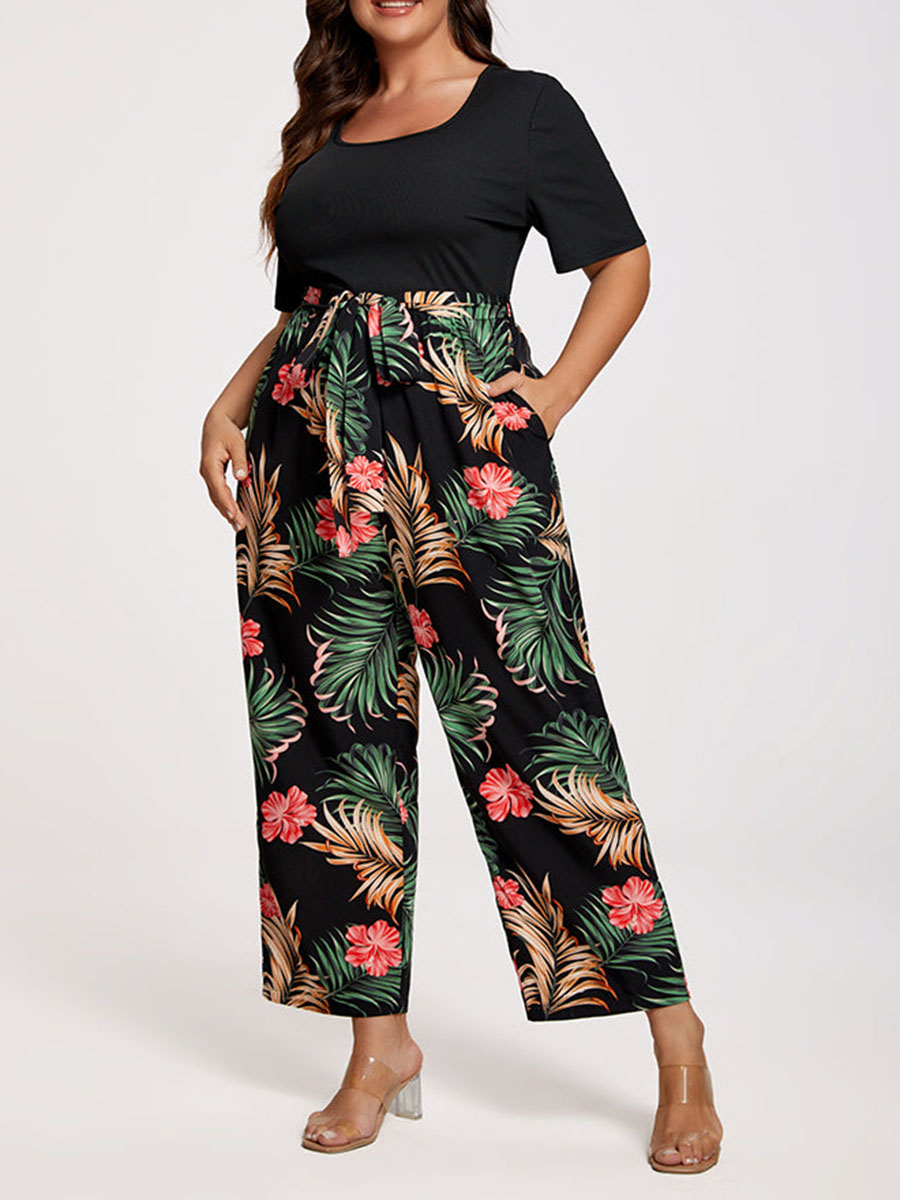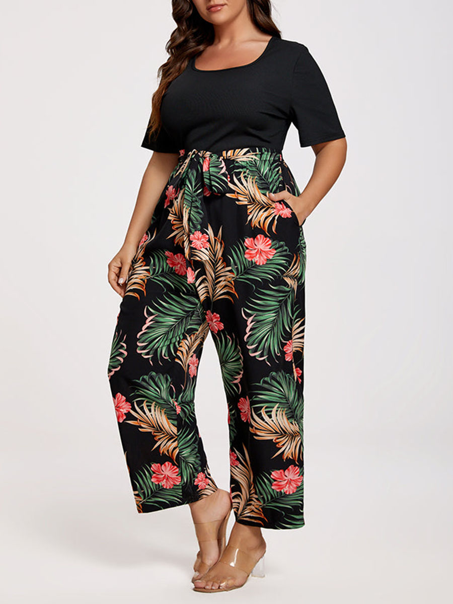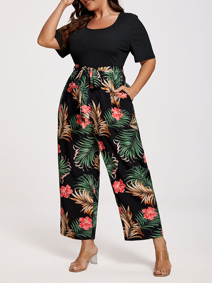 Plus Tropical Print Square Neck Belted Jumpsuit 978593